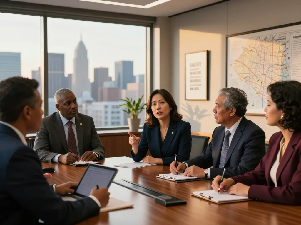 A professional setting in a US law firm, showcasing Miami's skyline and business discussions.